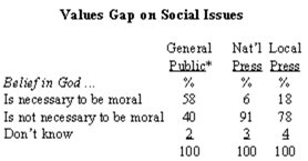 Another issue is coverage of faith issues — newsrooms are notoriously a-religious — way out of kilter with the the general public. This 2002 Pew research isn’t exactly on point, but I think it is illustrative: