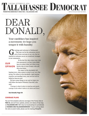 This front-page editorial penned by the Tallahassee Democrat editorial board summed up my thoughts on then-candidate Trump, when he visited Tallahassee. A key excerpt: