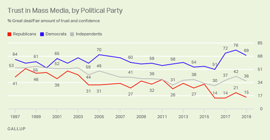 This look at the Gallup poll over the last 23 years is pretty amazing. In 2000, less than 5 points separated Democrats and Republicans when the question is about trust in media. Today, the gap is 54 points. Just 1.5 in 10 of Republicans have a great or fair amount of trust.
