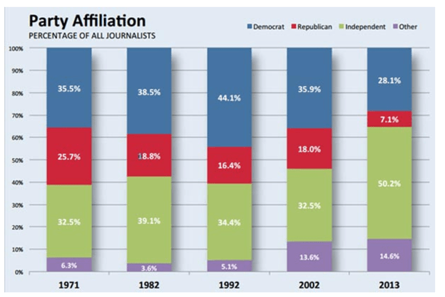 Below is a 16-year-old chart from Pew research. Even back then, the ratio of conservatives in the general public to the press was almost 5 to 1 for national press and almost 3 to 1 for local press. It’s fair to assume that this gap has widened further.