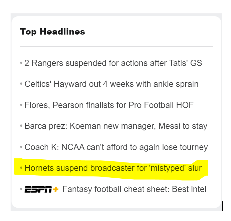 And ESPN coyly signals he is making excuses by saying he “mistyped” the word (test: read the ESPN headline without the quotations around “mistyped” and see if it reads any differently or less accurately).